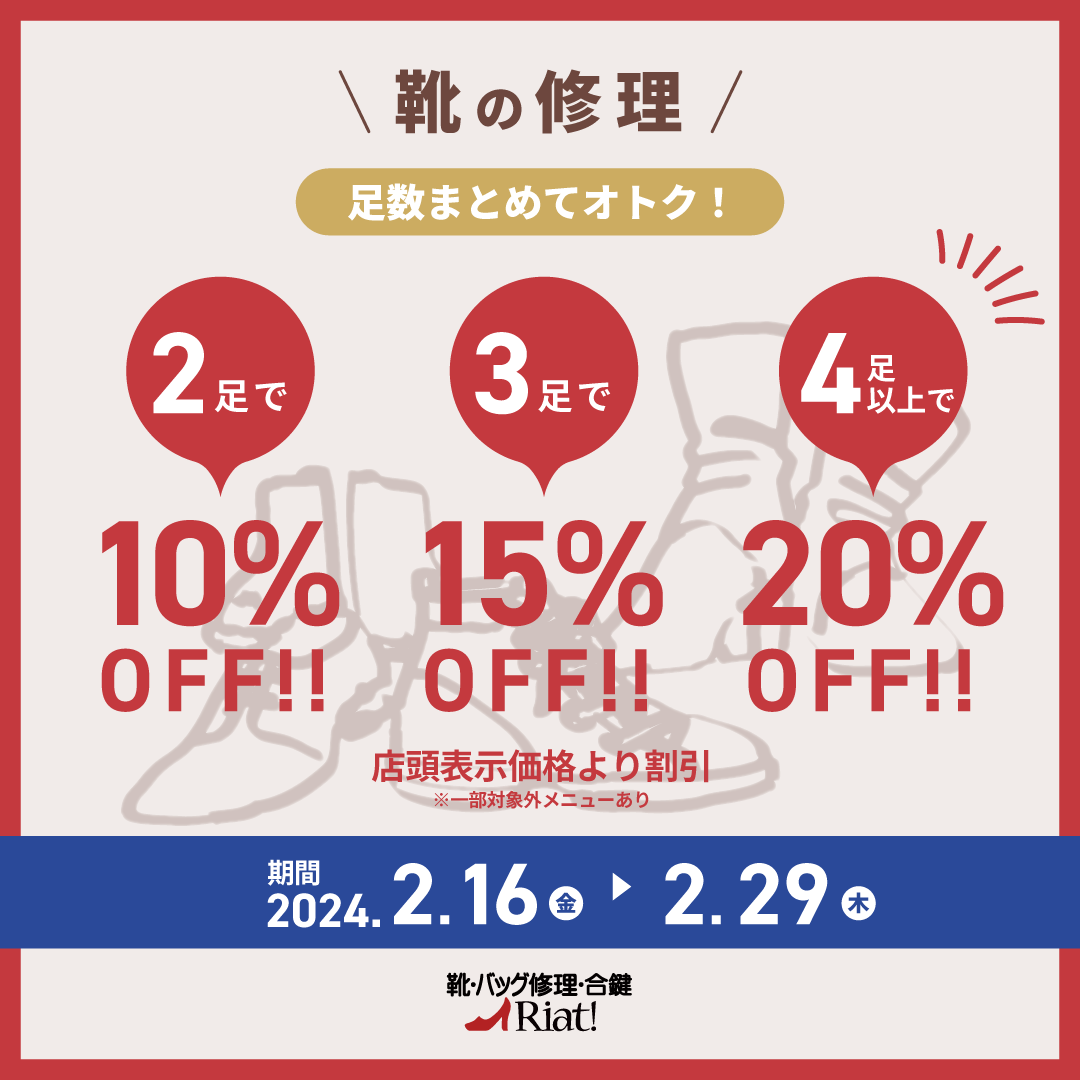 ※オールソール、バッグ修理・クレンジング&ケア、時計電池交換、シューケア用品、印鑑、iPhone 修理、合鍵、傘修理は割引対象外です。