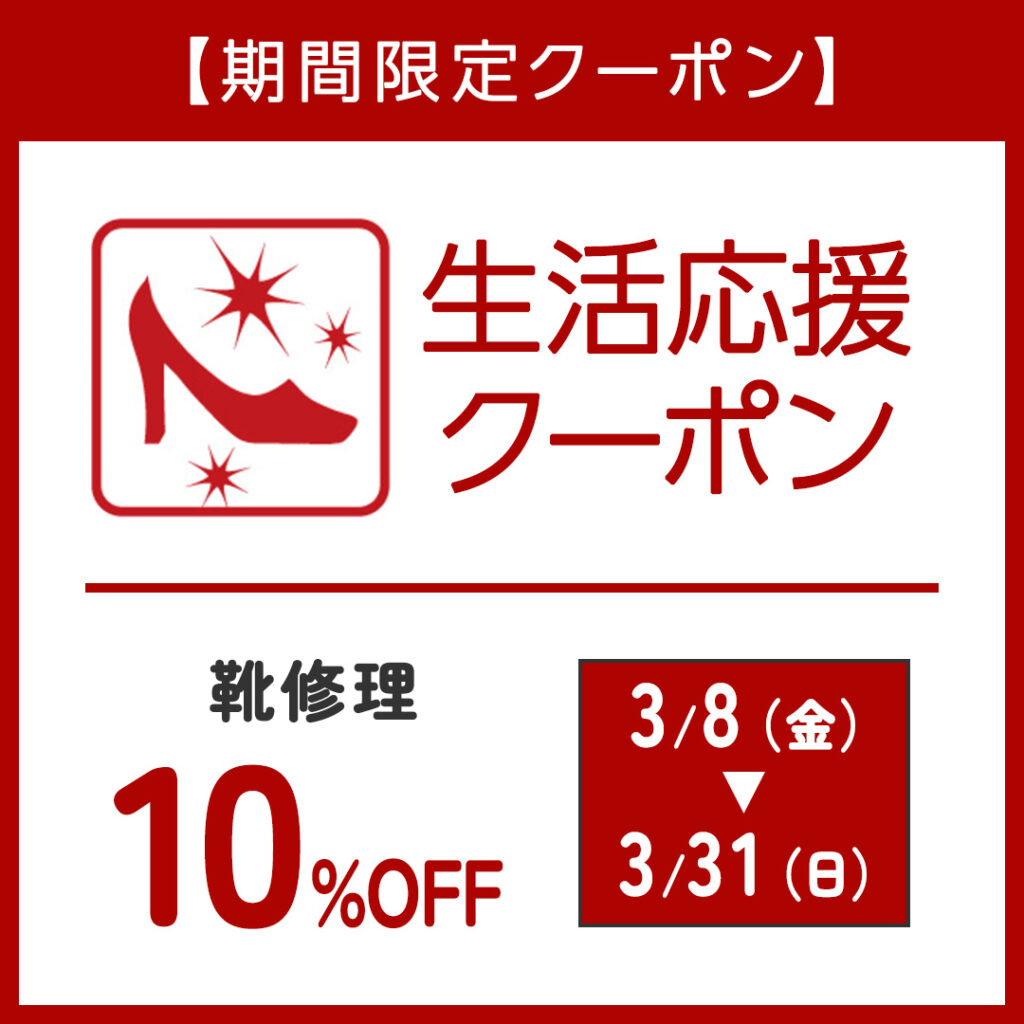 ※バッグ修理・クレンジング&ケア、オールソール、時計電池交換、シューケア用品、印鑑、iPhone 修理、合鍵、傘修理は割引対象外です。